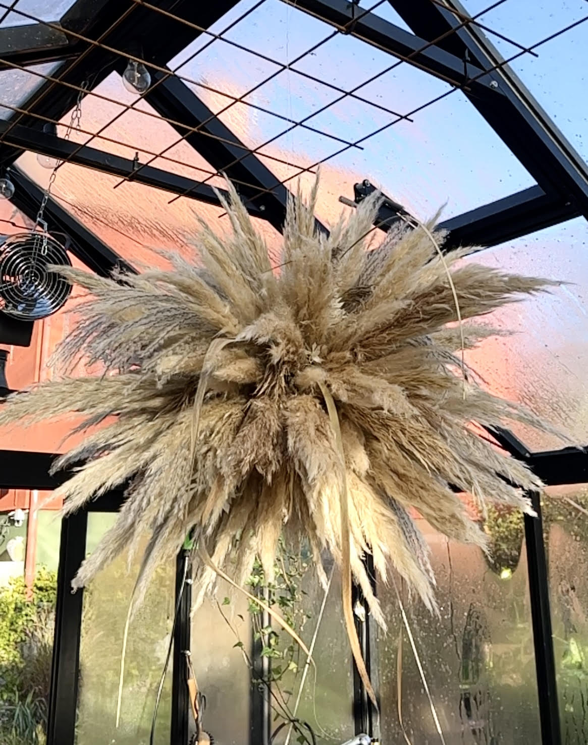 Just det här blomstermolnet är skapat av torkade blommor, gräs och flera olika sädeslag och är 60 cm brett och 50 cm djupt.